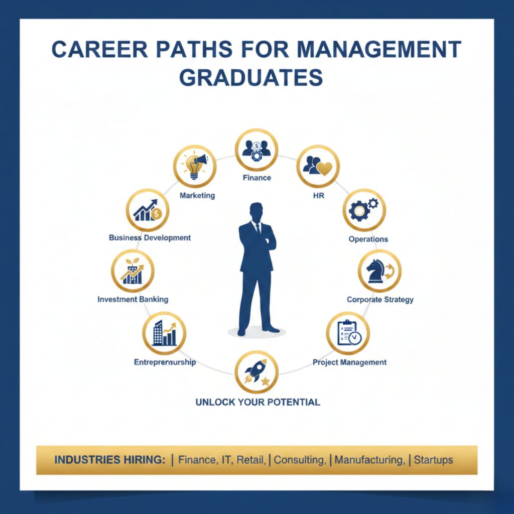 Industries hiring management graduates include finance, IT, retail, consulting, manufacturing, and startups.